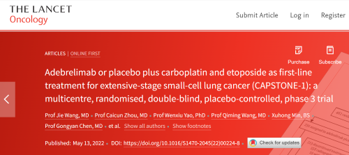 北京时间2022年5月14日,金年会金字招牌诚信至上医药自主研发的PD-L1抑制剂阿得贝利单抗治疗广泛期小细胞肺癌的III期临床研究(CAPSTONE-1研究)成果正式全文在线发表于国际权威学术期刊《柳叶刀·肿瘤学》(《THE LANCET Oncology》,影响因子41.316)。CAPSTONE-1研究结果显示,阿得贝利单抗联合化疗一线治疗广泛期小细胞肺癌相较于安慰剂联合化疗可以显著延长患者总生存期至15.3个月[1],刷新现有免疫药物一线治疗广泛期小细胞肺癌的总生存纪录[2]。