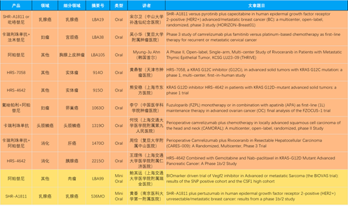本届大会,作为中国医药创新代表性企业的金年会金字招牌诚信至上医药共有46项抗肿瘤领域研究成果入围,包括4项最新突破性摘要(LBA)1,共涉及14项创新药。其中9项入选口头(Oral)报告,2项入选简短口头报告(Mini Oral),32项研究接收为壁报(Poster),3项研究接收为电子壁报(E-Poster),覆盖食管胃癌、妇科肿瘤、肝癌、乳腺癌、胰腺癌、肺癌、肉瘤、胆道癌、头颈鳞癌、前列腺癌、甲状腺癌等十余个领域。14款创新药包括10款已上市产品:注射用瑞康曲妥珠单抗(艾维达®,研发代号:SHR-A1811)、注射用卡瑞利珠单抗(艾瑞卡®)、苹果酸法米替尼胶囊(艾比特®)、甲磺酸阿帕替尼片(艾坦®)、马来酸吡咯替尼片(艾瑞妮®)、阿得贝利单抗注射液(艾瑞利®)、羟乙磺酸达尔西利片(艾瑞康®)、氟唑帕利胶囊(艾瑞颐®)、瑞维鲁胺片(艾瑞恩®)、海曲泊帕乙醇胺片(恒曲®),以及4款未上市产品,包括KRASG12C抑制剂HRS-7058、KRASG12D抑制剂HRS-4642、抗PD-L1/TGF-βRII双抗瑞拉芙普-α注射液(SHR-1701)、Trop-2 ADC SHR-A1921。2类新药盐酸伊立替康脂质体注射液(II)(越优力®)及国内首仿药昂丹司琼口溶膜(艾其速®)各有1项研究入选。