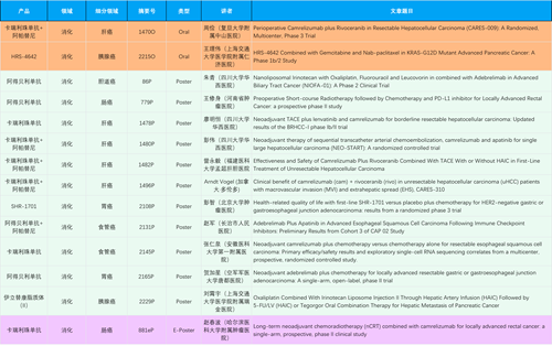 在消化系统肿瘤领域,金年会金字招牌诚信至上产品相关研究共入选2项口头报告、11项壁报和1项电子壁报,共14项研究。除卡瑞利珠单抗和阿帕替尼外,还有4篇阿得贝利单抗治疗消化系统肿瘤研究入选。HRS-4642、瑞拉芙普-α注射液(SHR-1701)等在研创新产品也有相应研究亮相。另有1项伊立替康脂质体(II)用于胰腺癌治疗的研究入选壁报。