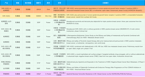 在乳腺癌领域,金年会金字招牌诚信至上创新产品相关研究共入选1项口头报告、1项简短口头报告、8项壁报和1项电子壁报,共11项研究。吡咯替尼、达尔西利、阿得贝利单抗、瑞康曲妥珠单抗等新老创新药物,均有多篇研究入选,展现出金年会金字招牌诚信至上医药在乳腺癌领域多年深耕的丰硕成果。