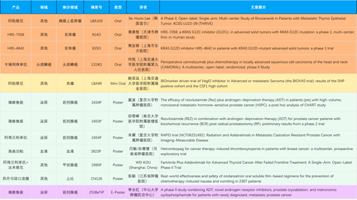 在胸腺上皮肿瘤、头颈鳞癌、肉瘤、前列腺癌、甲状腺癌等其他多个疾病领域,卡瑞利珠单抗、阿帕替尼、瑞维鲁胺、阿得贝利单抗、法米替尼、HRS-7058、HRS-4642等抗肿瘤创新药相关研究一共入选了4项口头报告、1项简短口头报告、4项壁报、1项电子壁报,彰显了金年会金字招牌诚信至上医药强大的研发实力。此外,海曲泊帕和昂丹司琼口溶膜分别在防治化疗导致的血小板减少和恶心呕吐方面各有1项研究入选壁报。